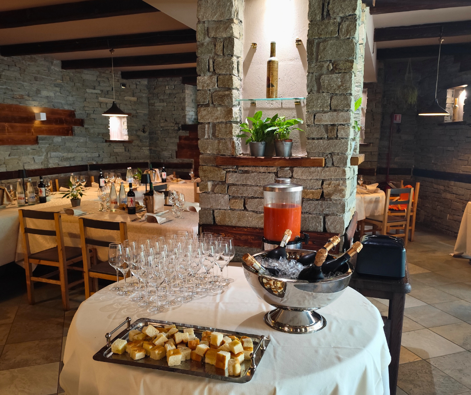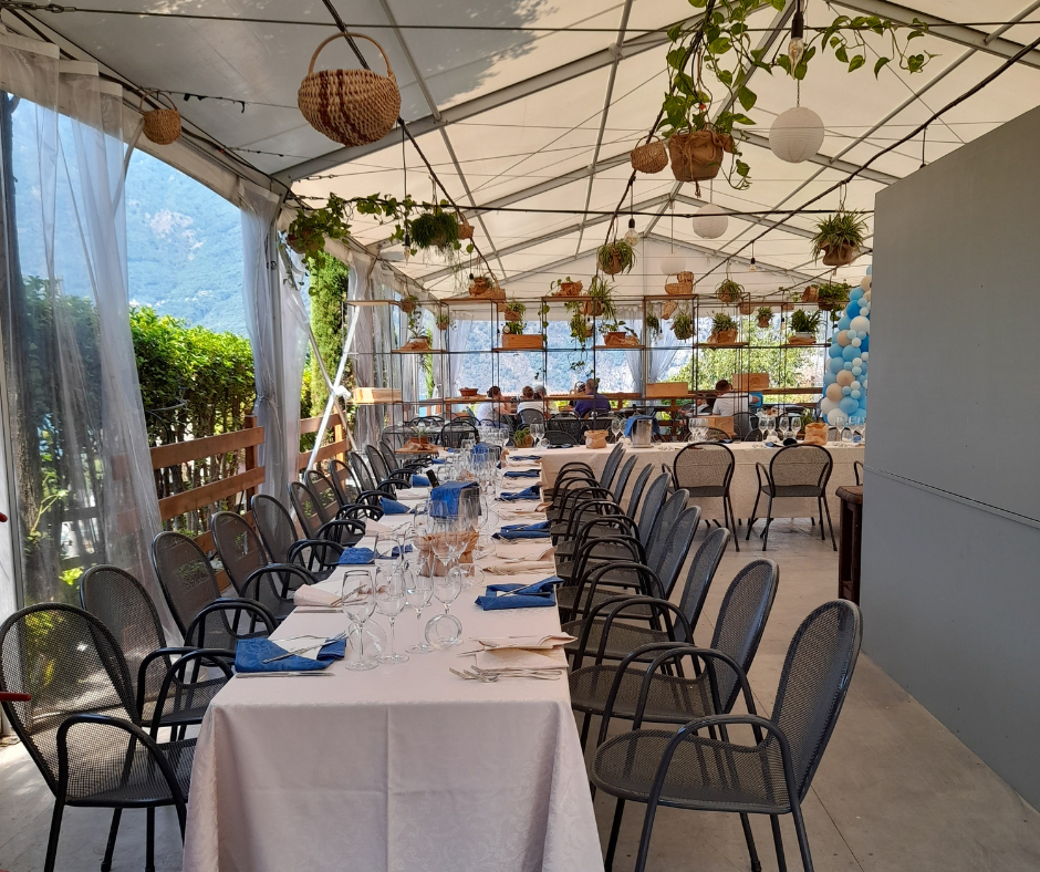 A seconda della tipologia di evento desiderata è possibile optare per un aperitivo all’aperto nel giardino con vista lago, una tavolata di gruppo nell’ampio salone con i tipici muri in sasso, un buffet per eventi con varie portate e finger food, un ricevimento completo nel Salone delle Feste con un massimo di 300 invitati, una degustazione di vini e prodotti locali nella nostra enoteca e molte altre opzioni.